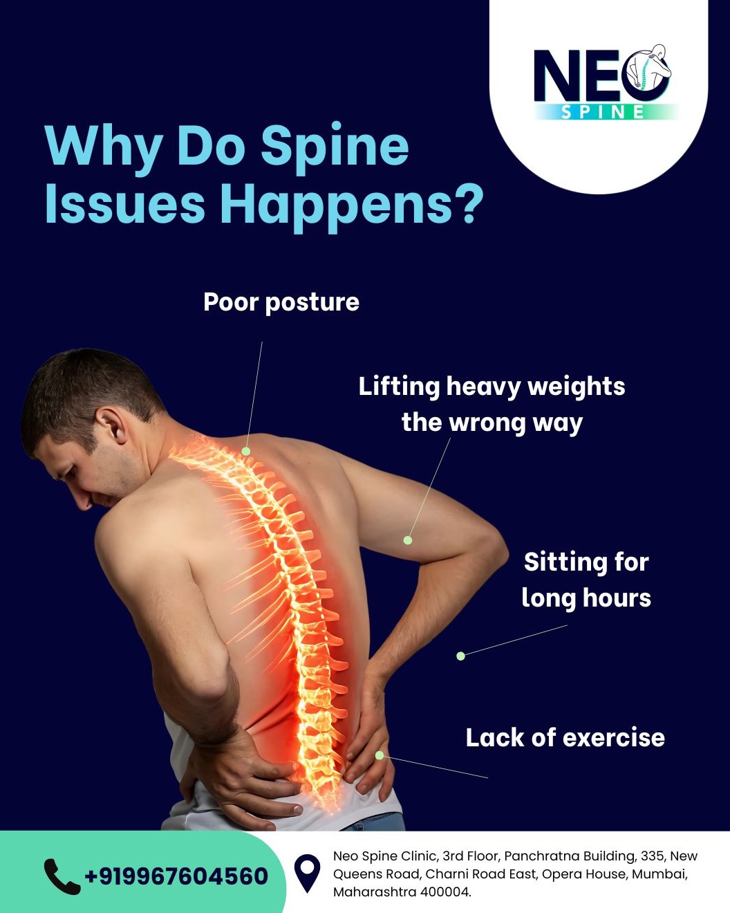 Ever wondered why spine issues happen? 🤔 It’s often due to poor posture, lifting heavy weights incorrectly, sitting for long hours, or a lack of regular exercise. These everyday habits slowly strain your spine, leading to pain, stiffness, or even disc problems. Maintaining a healthy posture, taking movement breaks, and staying active are essential to prevent spine-related disorders. Your spine supports every movement take care of it before it demands attention. Early awareness and timely treatment can make all the difference in maintaining lifelong spine health. If you’re searching for a trusted spine specialist in Girgaon, visit Neo Spine, led by the Best spine surgeon in Mumbai. Our expert back pain specialist and advanced Spinal deformity surgery clinic provide precise diagnosis and personalized treatment to restore mobility, relieve pain, and improve your quality of life. 👉 Book your appointment at Neo Spine today and take the first step toward recovery. 📍 Neo Spine Clinic, 3rd Floor, Panchratna Building, 335, New Queens Road, Charni Road East, Opera House, Mumbai, Maharashtra 400004 📞 +91 99676 04560 #spinehealth #backpain #spinecare #spinesurgeonmumbai #neospine #spinespecialist #posturecorrection