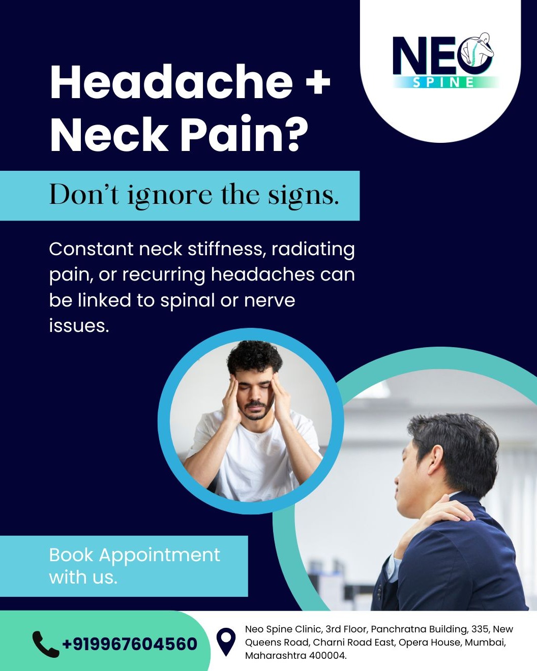 Headache + Neck Pain? Don’t ignore the signs. Constant stiffness, radiating neck pain, or recurring headaches may be more than just daily stress — they can indicate spinal or nerve-related problems. At Neo Spine, we specialize in advanced care tailored for your needs. From accurate diagnosis to expert headache pain treatment, our team ensures the right path to recovery. With the best surgeon for minimally invasive surgery, you’ll benefit from precise techniques, reduced risks, and faster healing. Many patients worry about the cost of minimally invasive neck surgery, but we provide transparent, affordable solutions. Your comfort and health matter to us, and we’re here to guide you through safe and smooth recovery after minimally invasive neck surgery. Looking for trusted neck treatment in Mumbai? Consult our neck surgeon specialist in Parel, explore advanced endoscopic neck surgery in Girgaon, or visit our spinal deformity surgery clinic in Dadar. With the best spine surgeon, top spine surgery hospital in Mumbai, and expert spine surgery center, our spine surgery specialists provide complete care. Best spine surgeon in mumbai.
