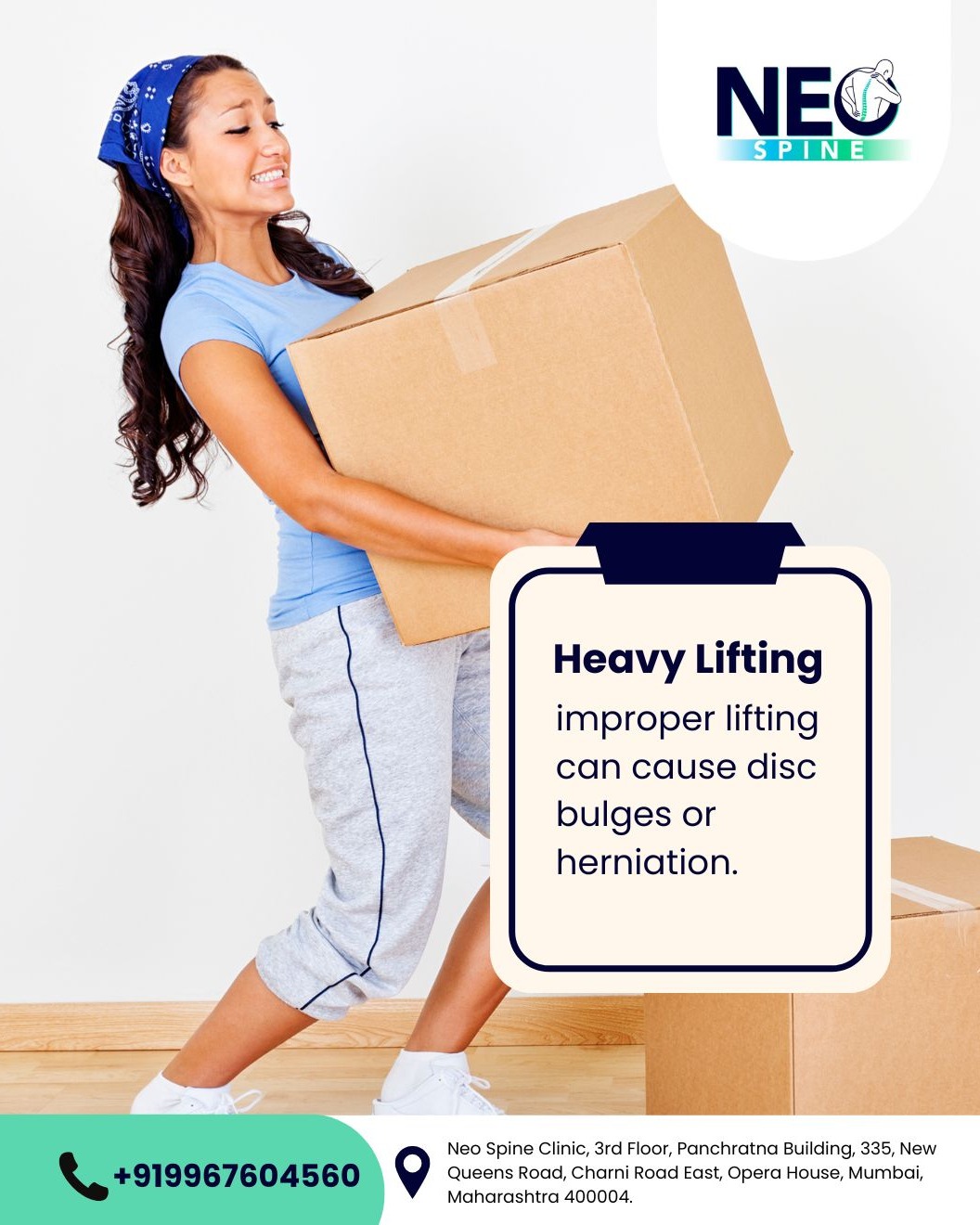 When you lift heavy objects incorrectly, it puts extra pressure on your spine, causing disc bulges or herniation. Always bend your knees, keep your back straight, and lift with your legs not your spine. Ignoring pain or strain can lead to long-term back problems and restricted movement. If you experience back pain, numbness, or tingling after lifting, seek expert help immediately. Early diagnosis and proper treatment can prevent further damage and restore spine health. Protect your back lift smart, stay strong, and move safely! Consult the herniated disc doctor in Girgeon or the herniated disc specialist in Mumbai for expert diagnosis and care. Our herniated disc surgeon at Neo Spine provides advanced solutions at the leading herniated disc hospital and herniated disc clinic. Get effective herniated disc treatment and live pain-free.